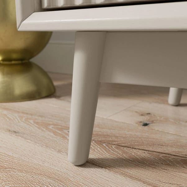 If you’re looking for a stylish and functional sideboard for your home, then look no further! The Neena Large Sideboard with a washed white painted finish is the perfect piece for all your storage needs. The spacious shelving and fluted front design offer plenty of storage space for dishes and other items, while the champagne metal handles and angled legs add a touch of class to the overall look. Not to mention, the light grey finish will give your room a timeless, yet modern look that you and your guests are sure to appreciate.
