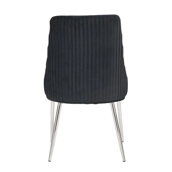Upholstered in a luxuriously soft velvet fabric with a delicate pleated back, the Peyton chair would add a touch of modern luxury styling to any room. The grey velvet upholstery is perfectly complemented by the sleek chrome finished metal legs, whilst the foam padded seat and backrest provide luxurious comfort.