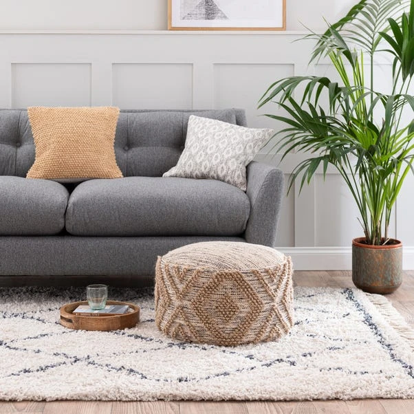 We have the perfect seating for when you want to relax, or for when your friends come round. Made from recycled cotton and jute, this stunning pouffe in a natural colourway complements an array of decors. The looped diamond detailing on its side contrasts beautifully with the multi-tonal, soft cotton. Its many uses and stylish looks make it a welcome addition to any living space.